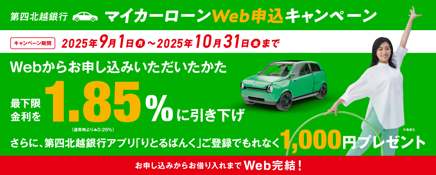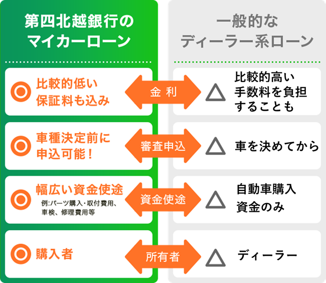 第四北越銀行のマイカーローンなら、お使いみちで金利は変わりませんので、ご安心してお申し込みください。