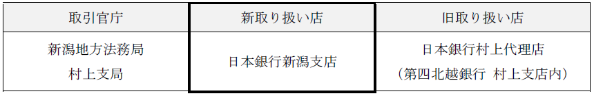 これに伴い、2025年11月4日(火)より、新潟地方法務局村上支局における供託金、供託振替国債、供託有価証券の取り扱いを下記のとおり変更させていただきます。お客さまには大変ご不便をおかけいたしますが、何卒ご理解とご協力を賜りますようお願い申し上げます。