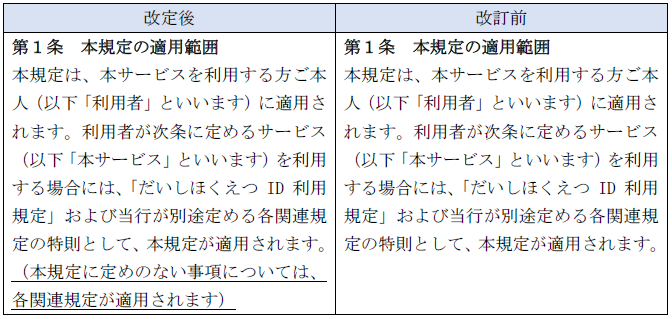 - 本規定の適用範囲に定めのない事項については各関連規定が適用されることを明記いたします(下線部分が改定箇所)。