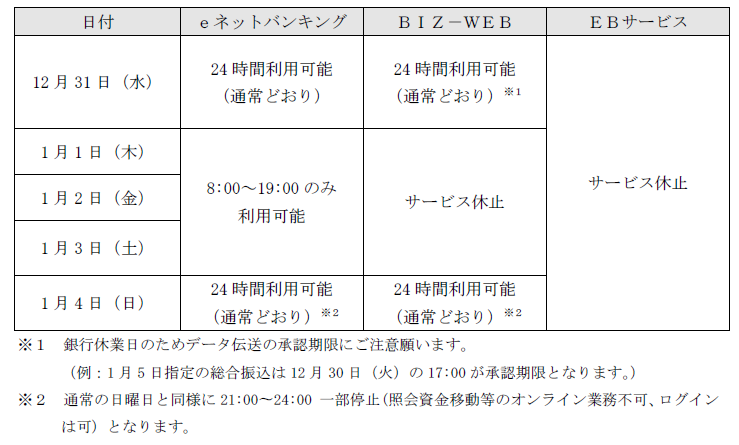 年末年始の各種サービスのご利用時間は、下記の通りとなります。