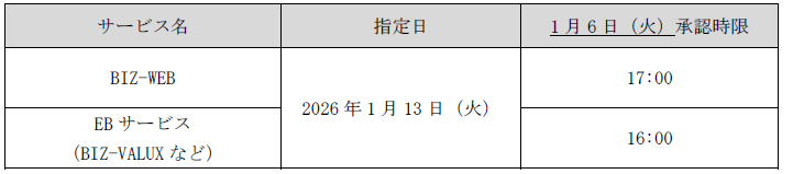 - 各種サービスにおける納付月12月(指定日2026年1月13日)の地方税納付の承認期限は、下表の通りとなりますのでご注意ください。