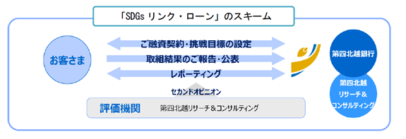 お客さまがSDGsやESGに関連するSPTsを設定し、その達成状況に応じて適用金利等が変更となる商品で、当行では2022年6月より取り扱いを開始しています。SPTsの妥当性やSDGs・ESGに関する取り組みの適切性について、第三者評価を取得するスキームとしており、第四北越リサーチ&コンサルティング 株式会社が評価を行います。なお、本ローンのフレームワークは、外部専門機関である株式会社 格付投資情報センターより「サステナビリティ・リンク・ローン原則」および「グリーンローン及びサステナビリティ・リンク・ローンガイドライン」に対して整合的であるとの評価を取得しております。