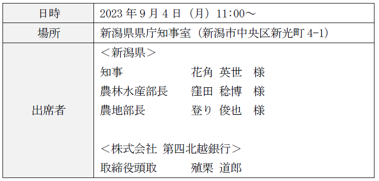 株式会社 第四北越銀行(頭取:殖栗 道郎)は、観測史上例を見ない記録的な猛暑・少雨により、深刻な渇水被害を受けられた方々へのご支援や、農地の復旧などに役立てていただくため、新潟県へ1,000万円の寄付を行いますので、お知らせいたします。