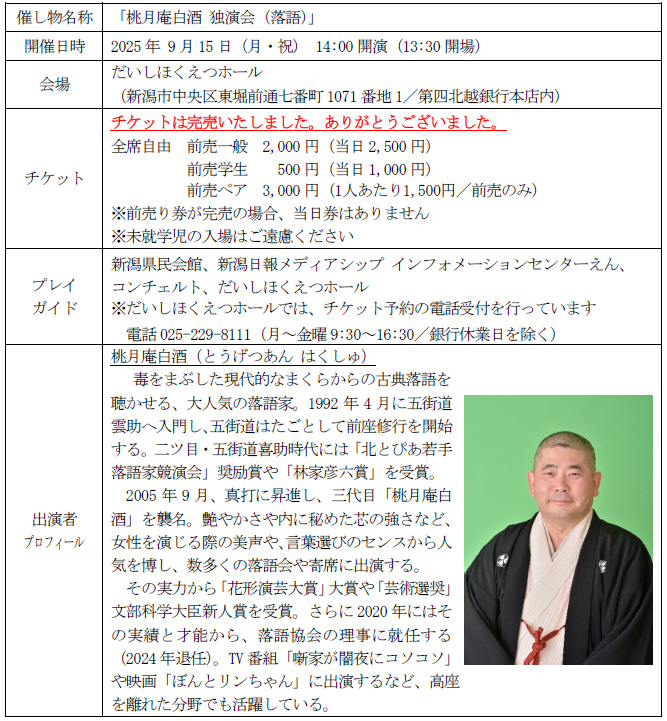 株式会社 第四北越銀行(頭取:殖栗 道郎)では、下記のとおり「桃月庵白酒 独演会(落語)」をだいしほくえつホールにて開催しますのでお知らせいたします。