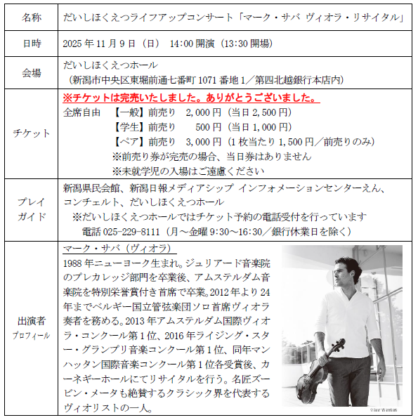 株式会社 第四北越銀行(頭取:殖栗 道郎)では、当行本店に併設するだいしほくえつホールにて、だいしほくえつライフアップコンサート「マーク・サバ ヴィオラ・リサイタル」を下記のとおり開催いたします。