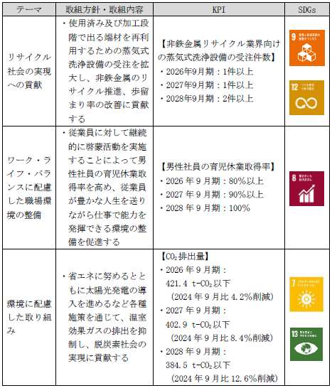 本ローンの締結において、同社は「リサイクル社会の実現への貢献」「ワーク・ライフ・バランスに配慮した職場環境の整備」「環境に配慮した取り組み」の3つのテーマを設定し、それぞれのテーマにおいて取組方針と重要業績評価指標(以下、「KPI」)を設定しました。KPIの達成状況については、第四北越リサーチ&コンサルティング 株式会社(代表取締役社長:柴山 圭一)が年1回モニタリングを実施し、達成に向けた伴走支援を行ってまいります。