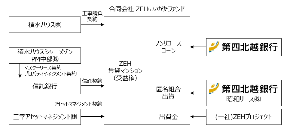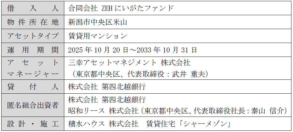 株式会社 第四北越銀行(頭取:殖栗 道郎)は、ZEH(ネット・ゼロ・エネルギー・ハウス)※1認証の賃貸マンションの開発と運用を目的とした不動産私募ファンド「合同会社 ZEHにいがたファンド」(以下、「本ファンド」)に対して、「SDGsグリーン・ローン※2」の実行および匿名組合出資を実施しましたので、お知らせいたします。