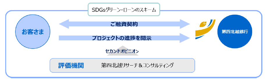 環境負荷低減に資する設備導入を行う際の資金として利用でき、①エネルギー効率、②クリーンな運送、③グリーンビルディング、④再生可能エネルギー、⑤その他環境改善効果があると判断できるプロジェクトが該当します。グリーンプロジェクト※3の妥当性やSDGs・ESGに関する取り組みの適切性について、第三者評価を取得するスキームとしており、第四北越リサーチ&コンサルティング 株式会社が評価を行います。