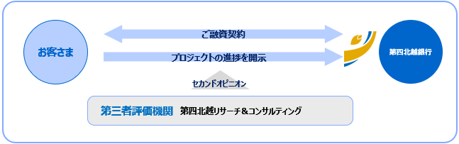 環境負荷低減に資する設備導入を行う際の資金として利用でき、①エネルギー効率、②クリーンな運送、③グリーンビルディング、④再生可能エネルギー、⑤その他環境改善効果があると判断できるプロジェクトが該当します。グリーンプロジェクト※2の妥当性やSDGs・ESGに関する取り組みの適切性について、第三者評価を取得するスキームとしており、第四北越リサーチ&コンサルティング 株式会社が評価を行います。