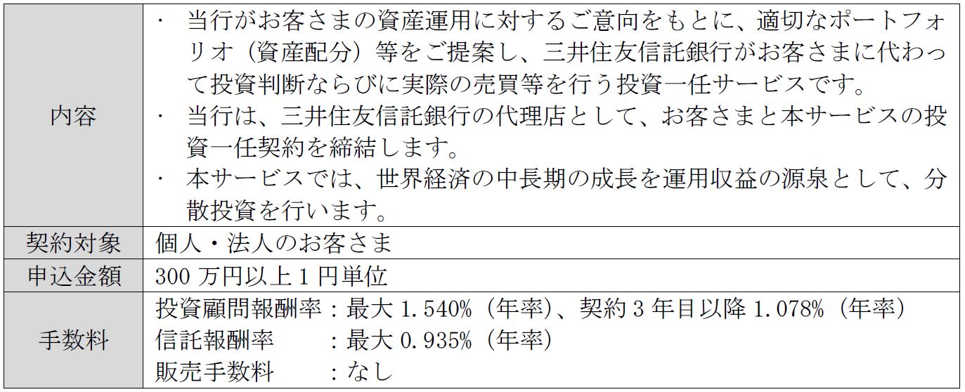 株式会社第四北越銀行(頭取:殖栗 道郎)は、2025年11月25日より、三井住友信託銀行 株式会社(取締役社長:大山 一也、以下「三井住友信託銀行」)を投資一任業者とする投資一任運用サービス「第四北越ファンドラップ」(以下「本サービス」)の取り扱いを開始しましたのでお知らせいたします。