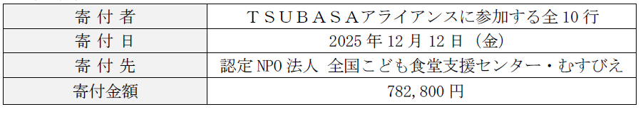 株式会社 第四北越銀行(頭取:殖栗 道郎)は、TSUBASAアライアンス※発足10周年を記念して、TSUBASAアライアンスに参加する全10行で寄付活動と社員の健康増進を目的としたウォーキング・キャンペーンを実施し、認定NPO法人 全国こども食堂支援センター・むすびえ(東京都渋谷区、理事長 三島 理恵、以下「むすびえ」)へ下記のとおり寄付しましたので、お知らせいたします。