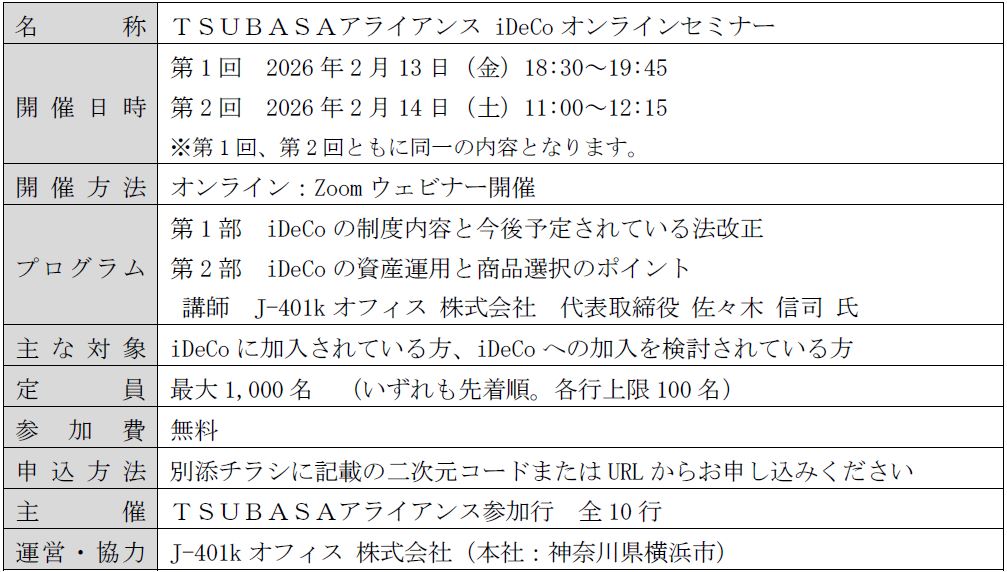 株式会社 第四北越銀行(頭取:殖栗 道郎)は、2026年2月13日(金)および14日(土)に、TSUBASAアライアンス※に参加する全10行で「TSUBASAアライアンス iDeCoオンラインセミナー」を共同開催しますので、お知らせいたします。