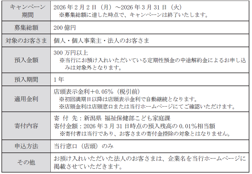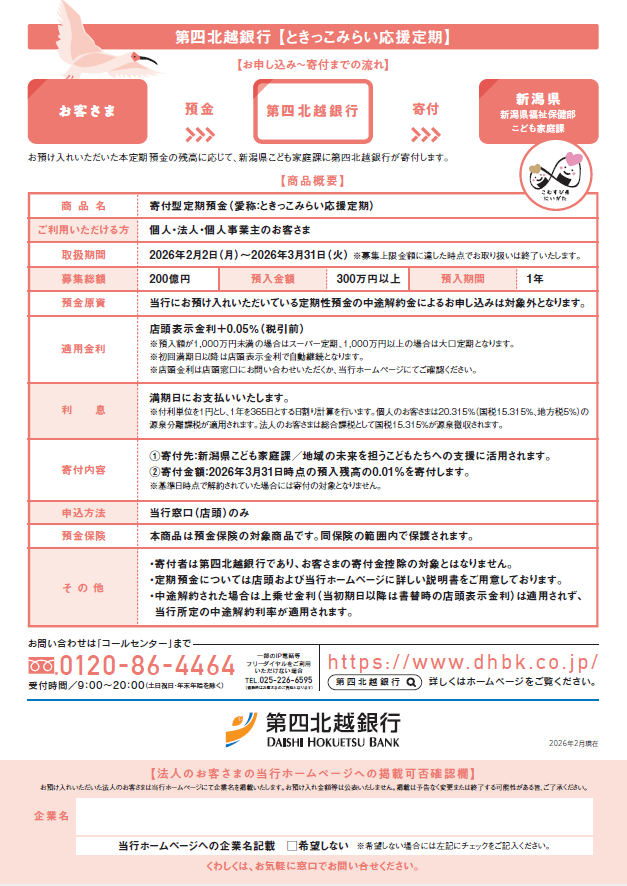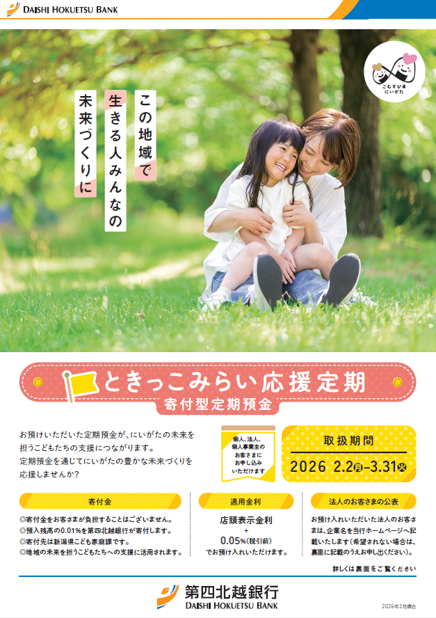 株式会社 第四北越銀行(頭取:殖栗 道郎)は、2026年2月2日より、「寄付型定期預金『ときっこみらい応援定期』キャンペーン」を下記のとおり実施しますので、お知らせいたします。
