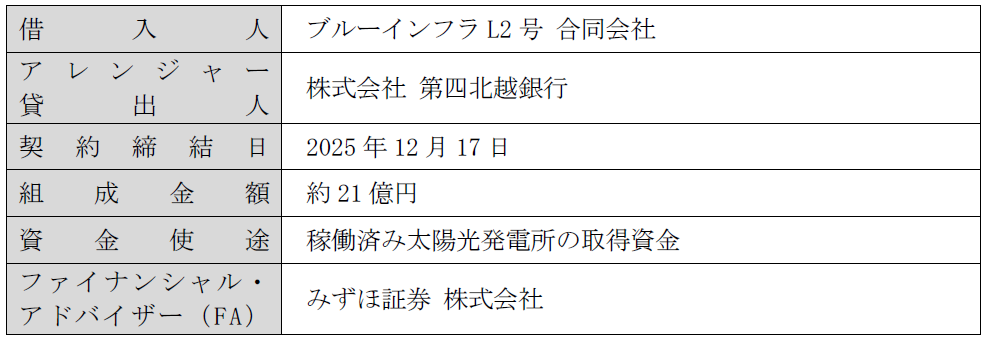 株式会社 第四北越銀行(頭取:殖栗 道郎)は、特別目的会社「ブルーインフラL2号 合同会社」(本社:東京都千代田区、以下、「ブルーインフラL2号」)を借入人とする太陽光発電事業向けプロジェクトファイナンス※1(以下、「本件」)を組成しましたので、お知らせいたします。