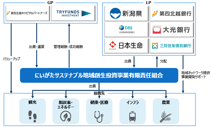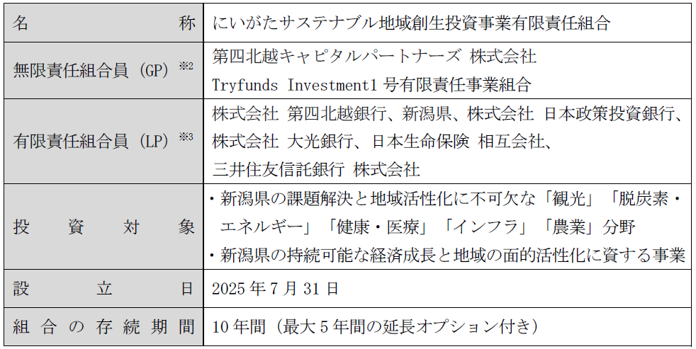 株式会社 第四北越銀行(頭取:殖栗 道郎)と第四北越キャピタルパートナーズ 株式会社(社長:川邊 正則)は、Tryfunds Investment1号有限責任事業組合※1(代表組合員:株式会社 Tryfunds Investment)、新潟県(知事:花角 英世)、株式会社 日本政策投資銀行(社長:地下 誠二)、株式会社 大光銀行(頭取:川合 昌一)と共同で設立した「にいがたサステナブル地域創生投資事業有限責任組合」(以下、「本ファンド」)について、本ファンドの趣旨にご賛同いただいた日本生命保険 相互会社(社長:朝日 智司)および三井住友信託銀行 株式会社(社長:大山 一也)より、追加出資を受け入れましたので、お知らせいたします。