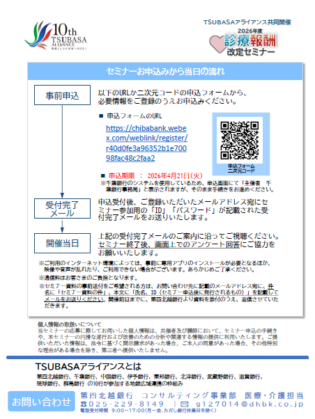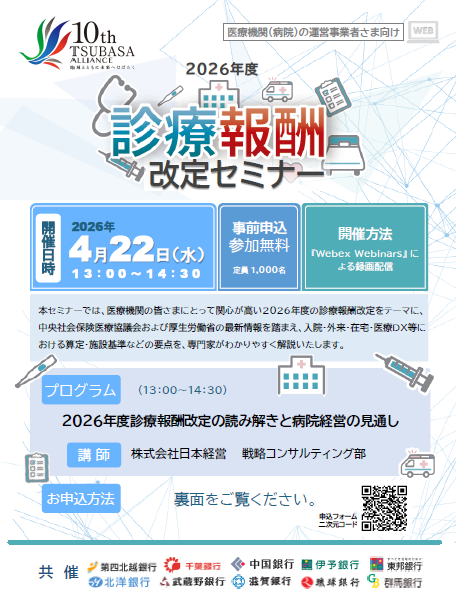 株式会社 第四北越銀行(頭取:殖栗 道郎)は、2026年4月22日(水)に、TSUBASAアライアンス※連携施策として、「診療報酬改定WEBセミナー」を開催しますのでお知らせいたします。