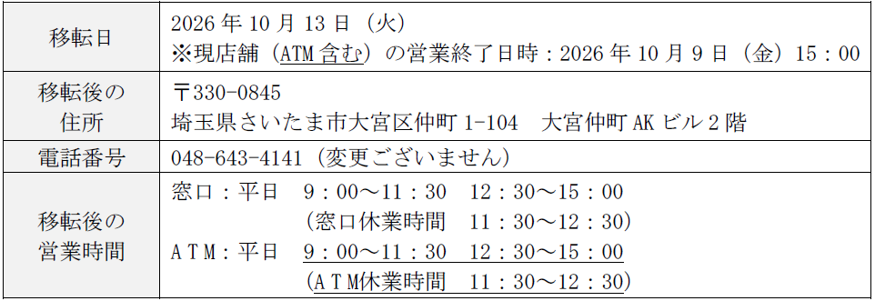 株式会社 第四北越銀行(頭取:殖栗 道郎)は、店舗老朽化による建替え工事に伴い、2026年10月13日より「大宮支店・北浦和支店」を下記のとおり移転し、仮店舗にて営業を開始しますのでお知らせいたします。