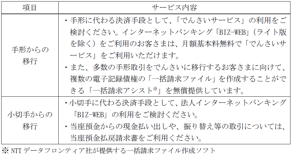 当行は、デジタルサービス移行に向けたお客さまへの支援を一層進めるとともに、デジタル化の普及・促進を通じて、お客さまの「業務効率化による生産性向上」、「手形・小切手の現物紛失回避等によるリスク低減」、「印紙不要等によるコスト削減」などの実現と紙削減による環境負荷低減に努めてまいります。