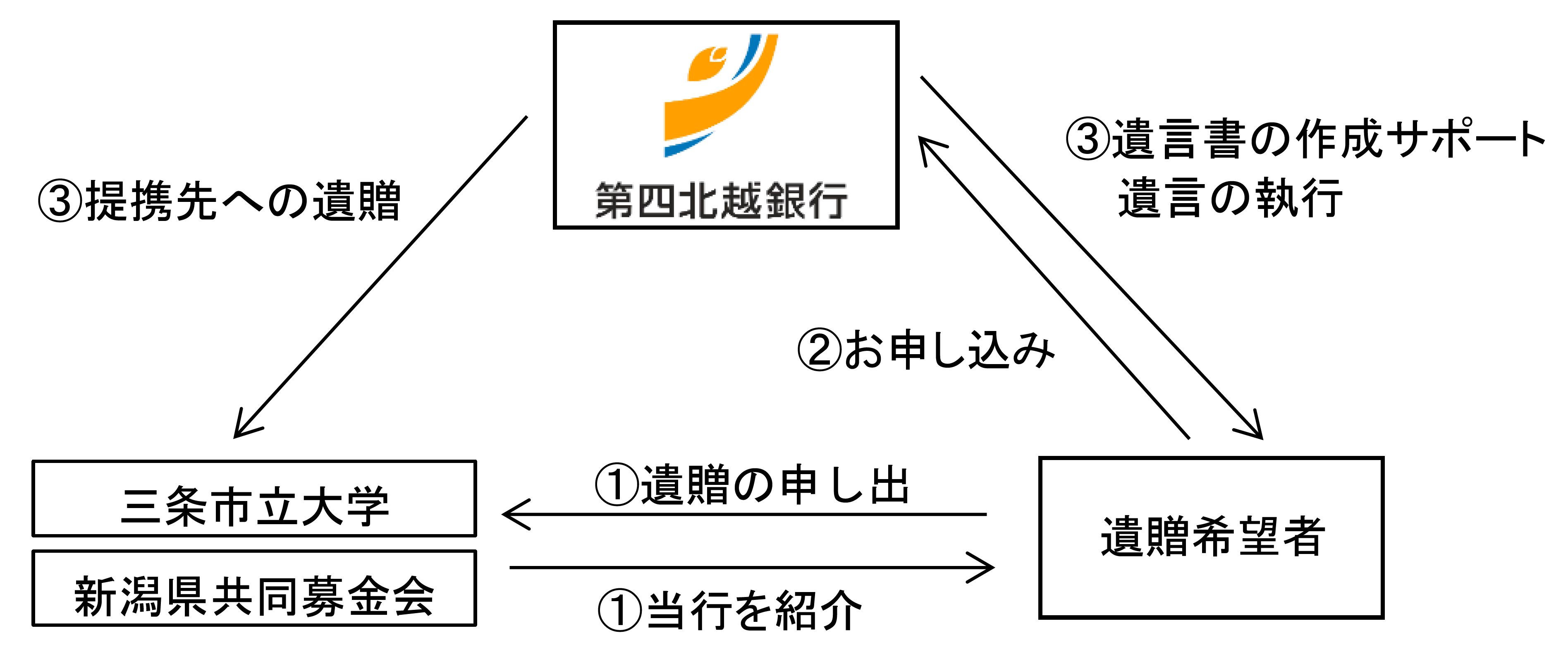①三条市立大学および新潟県共同募金会(以下、提携先)が、当行の遺言信託業務を利用して提携先への遺贈を希望される方(以下、希望者)に対し、当行を紹介します。