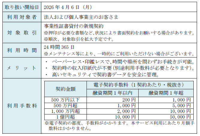 株式会社 第四北越銀行(頭取:殖栗 道郎)は、お客さまの利便性向上やペーパーレス化の推進を目的として、2026年4月6日(月)より、事業性融資における「電子契約サービス」(以下、「本サービス」)の取り扱いを開始しますのでお知らせいたします。