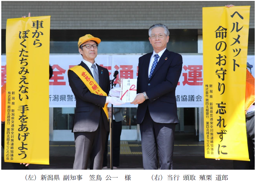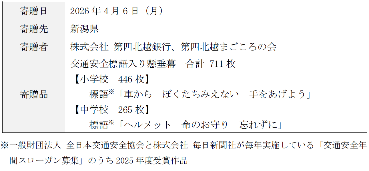 株式会社 第四北越銀行(頭取:殖栗 道郎)は、当行役職員の有志によって構成される第四北越まごころの会※とともに、下記のとおり、新潟県を通じて県内の小・中学校に交通安全標語入り懸垂幕を寄贈しましたのでお知らせいたします。